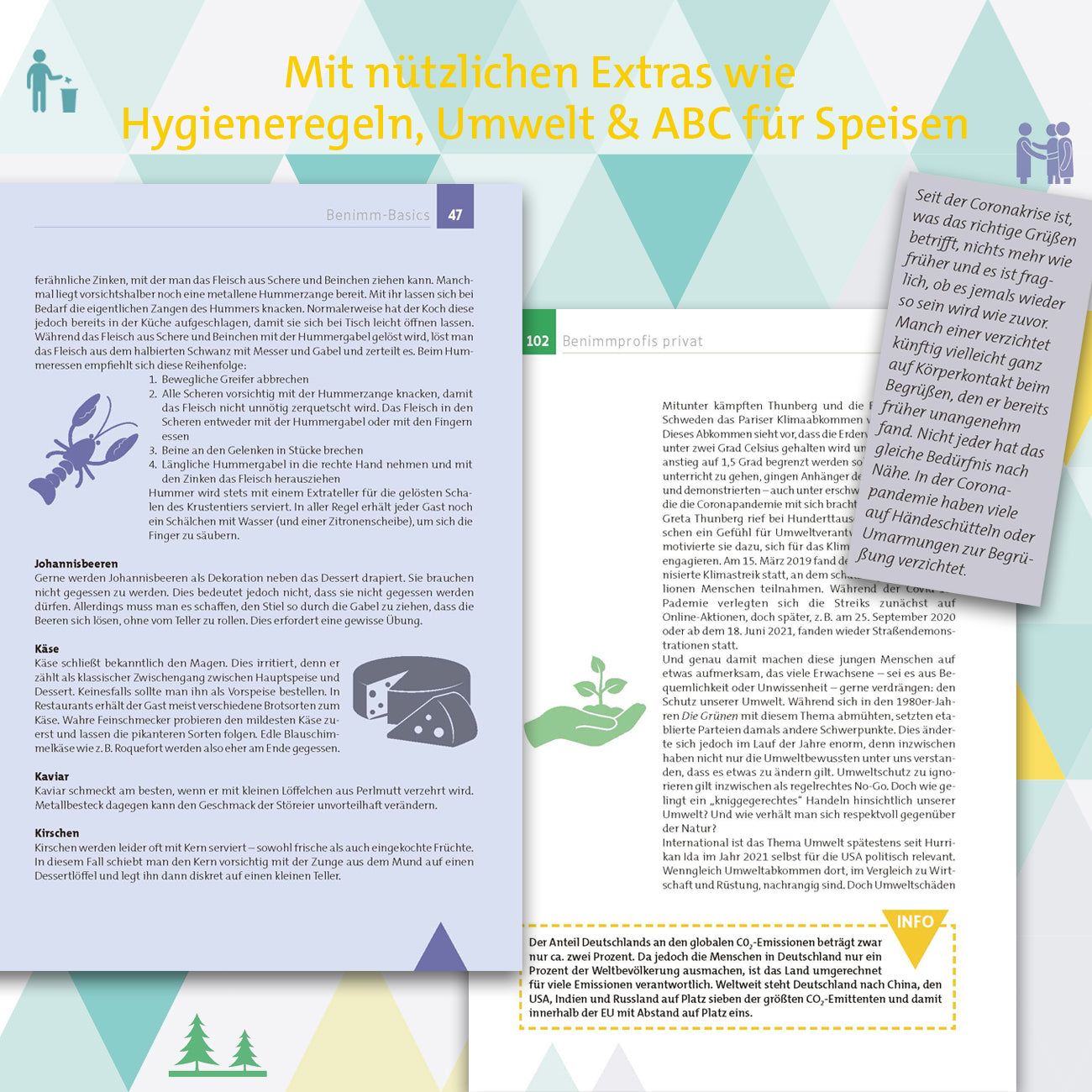 - Nützliches Extra: Neu sind die beiden Bereiche Hygiene und Umwelt. Wie verhält man sich bei einem Ausflug in die Natur korrekt und darf man jemand anderes auf sein/ihr fehlerhaftes Verhalten in Sachen Umweltschutz hinweisen?