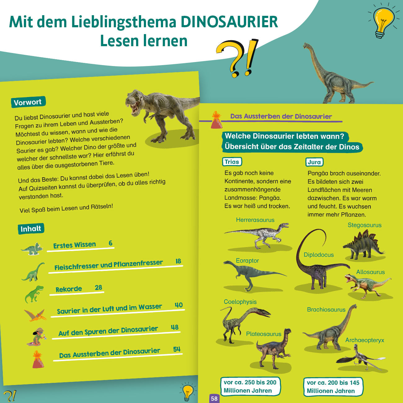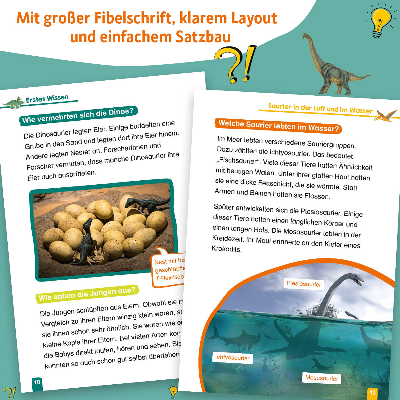 Die bunte Welt des Wissens führt Erstleser*innen spielerisch an das Lesen heran. Die farbenfrohen Seiten sprudeln nur so über vor beeindruckenden Informationen rund um die geheimnisvolle Welt der Dinosaurier. Wissenshungrige Leseanfänger*innen kommen hier voll auf ihre Kosten! Sie erfahren beispielsweise wer der schnellste Dinosaurier war, ob Meeressaurier Eier legten, wie der klügste Dinosaurier heißt, warum die Dinosaurier ausgestorben sind und noch vieles mehr.