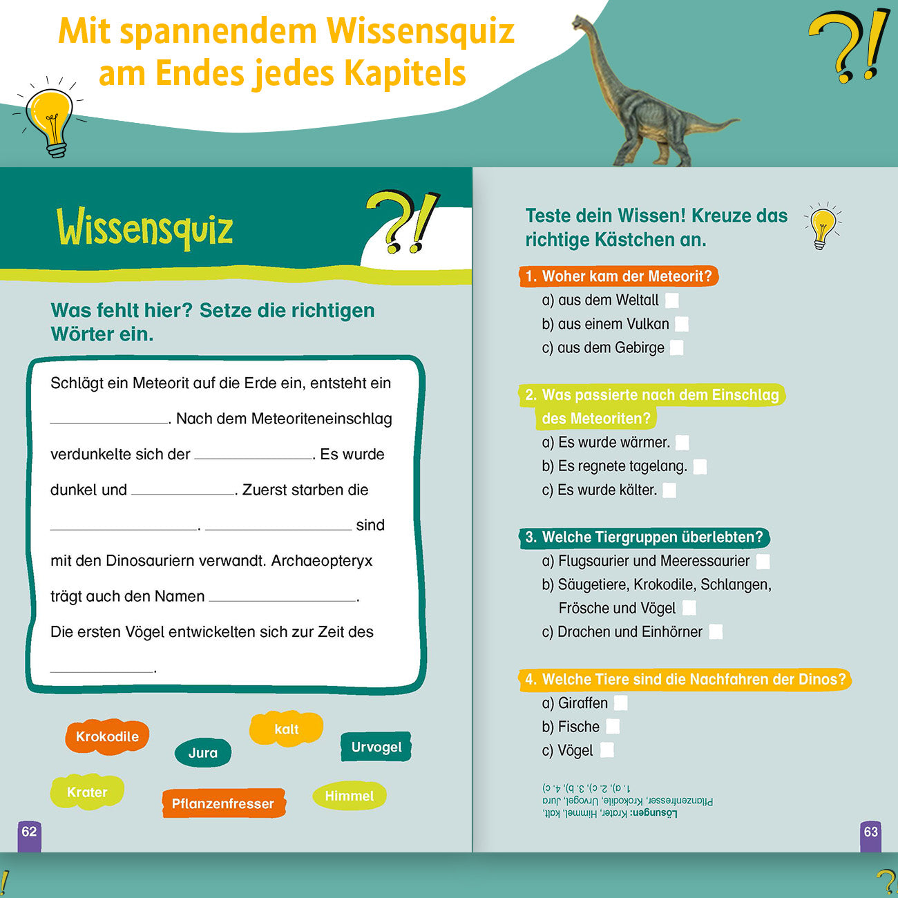 - Viele Quizfragen rund um das Thema „Dinosaurier“: Beim Quiz am Ende eines jeden Kapitels zeigt sich, wie aufmerksam die vorherigen Seiten gelesen wurden.