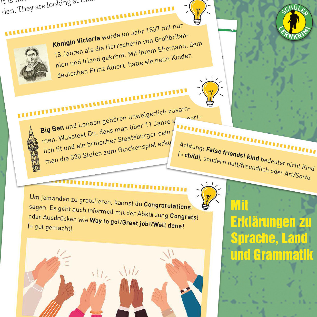 • Infokästen zu Sprache und Grammatik: Zusätzliche Infos, Tipps und Wissenswertes zu Sprache, Grammatik und Landeskunde ergänzen den Schüler-Lernkrimi „Students Undercover“.