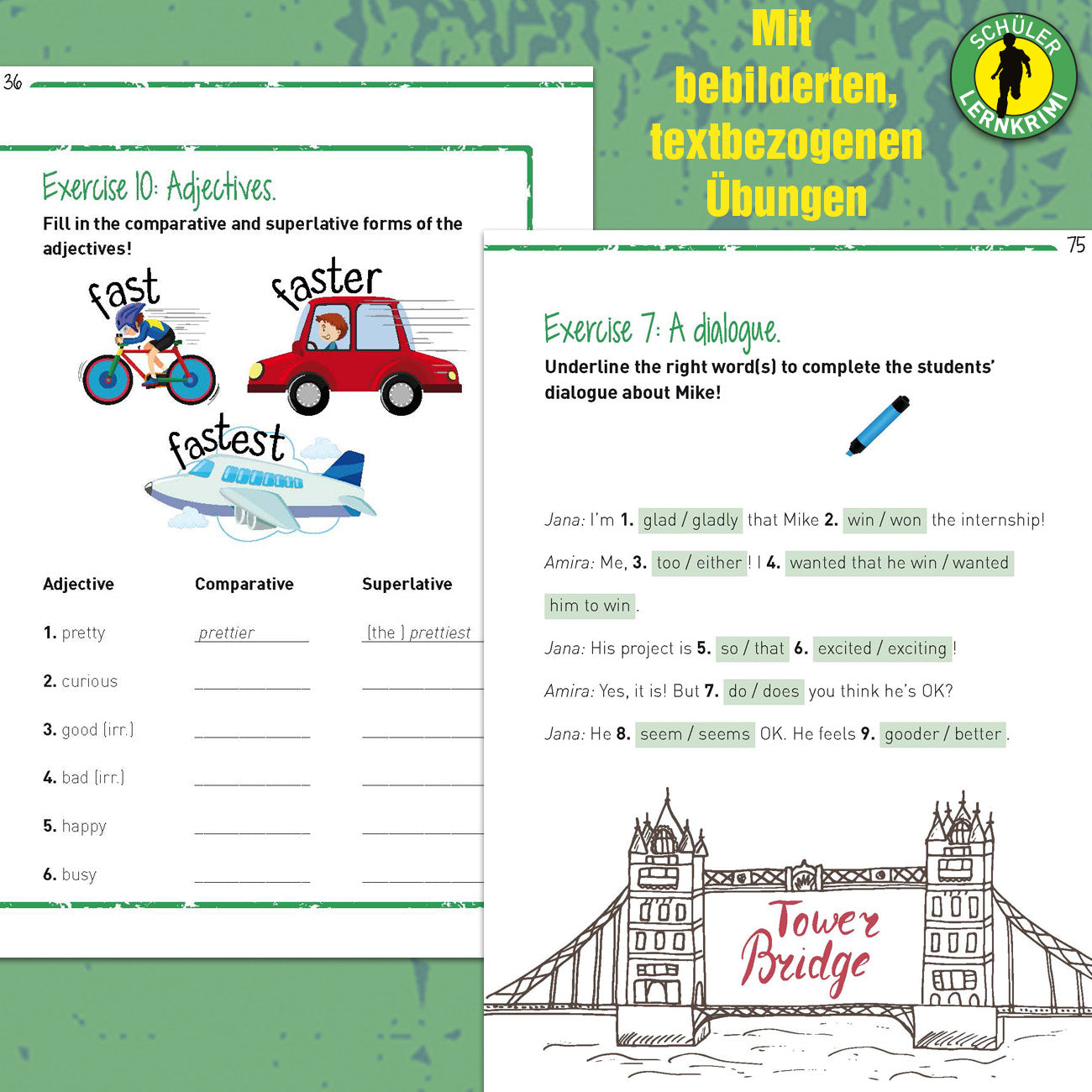 Ihr Kind hat bereits zwei oder drei Jahre Englischunterricht und Sie sind auf der Suche nach einer spannenden Englischlektüre, die zusätzlich zur Schule gelesen werden kann? Die Grammatik- und Wortschatzkenntnisse verbessert und dabei jede Menge Spaß bringt? Die neue Reihe der Schüler-Lernkrimis folgt in Aufbau und Konzept der bewährten und erfolgreichen Reihe „Lernkrimi“. Dabei wird mit authentischen Geschichten das erfolgreiche Übungskonzept aufgegriffen und der Zielgruppe Schüler*innen angepasst. In den mitreißenden und lebendigen Handlungen geht es um Themen, die Jugendliche ansprechen und zum Sprachenlernen motivieren. „Students Undercover“ enthält Thriller- und Spionage Elemente und wurde von einer muttersprachlichen Autorin verfasst und mit textintegrierten, teilweise bebilderten Übungen didaktisch aufbereitet. Schwierige Wörter werden in Vokabelkästen direkt auf jeder Seite übersetzt und Infokästen liefern zusätzliche Informationen zu Landeskunde und sprachlichen Eigenheiten. So tauchen Schüler*innen ab dem 2./3. Lernjahr in die englische Sprachwelt ein und erweitern mit dem einzigartigen Lernkonzept spielerisch ihre Sprachkompetenzen. Die Schüler-Lernkrimis sorgen für Spannung beim Lesen und schnelle Erfolgserlebnisse beim Sprachenlernen!