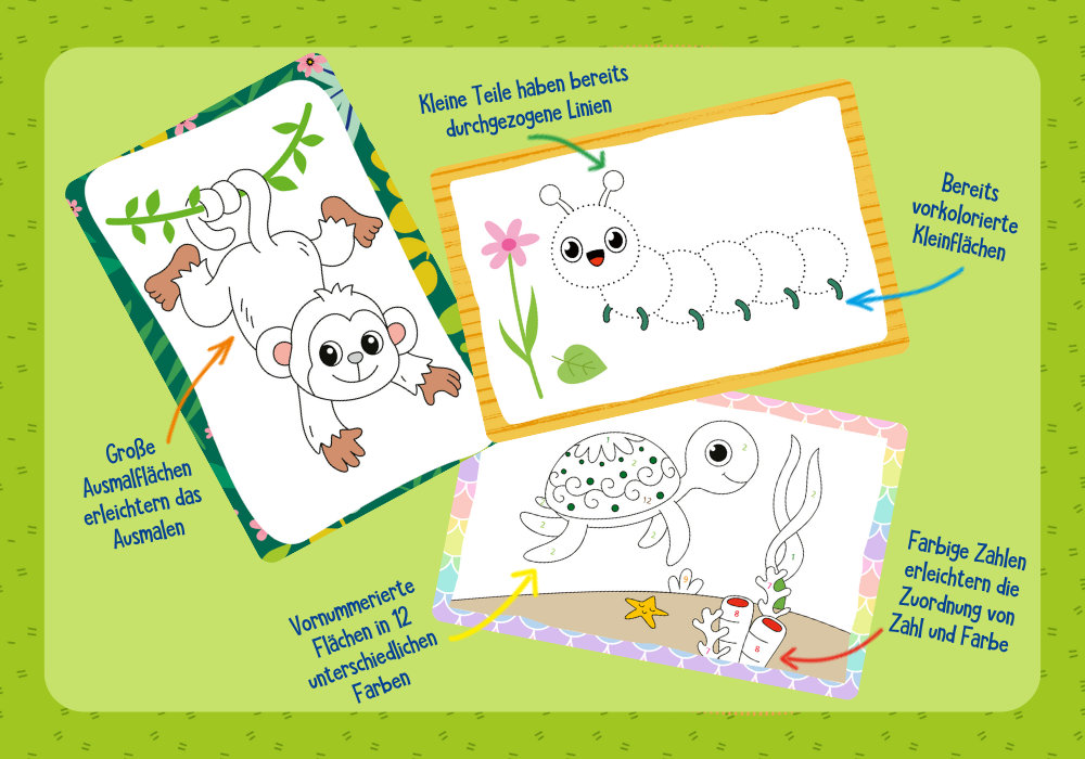 50 altersgerechte Motive warten darauf, von kleinen Künstler*innen ausgemalt zu werden! Die verschiedenen Motive sind groß abgebildet, sodass auch kleinere Kinder sie gut ausmalen können. Die Umrisse der Flächen sind deutlich gekennzeichnet, einige Flächen sind bereits vorkoloriert. Durch das Verbinden der Punkt-zu-Punkt-Bilder werden spielerisch erste Schwünge geübt und die Feinmotorik trainiert. Das Malen-nach-Zahlen-Prinzip bringt buntes Malvergnügen! Die Flächen sind bereits vornummeriert in 12 unterschiedlichen Farben. Die farbigen Zahlen erleichtern die Zuordnung von Zahl und Farbe.
