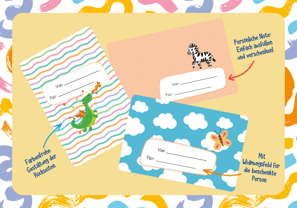 Auf den farbenfroh gestalteten Kartenrückseiten ist ein Widmungsfeld zu finden. In die Zeile "Von" kann der Name der kleinen Künstlerin beziehungsweise des kleinen Künstlers eingetragen werden, in die Zeile "Für" der Name der beschenkten Person. Für Familie und Freunde sind die kleinen Meisterwerke ein liebevoller Gruß und ein tolles Geschenk. Darüber freut sich wirklich jeder!